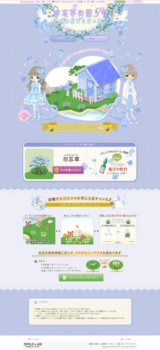 2023-02-09 勿忘草の贈り物~想い届ける白い鳩~ イベント ガーデン 合成 イベントきせかえ 合成きせかえ 勿忘草(100383) 勿忘草ハートリース ぴこぴこ鳩と勿忘草ハートリース 勿忘草のハート髪飾り まとう勿忘草と想いを運ぶ鳩 勿忘草【ピンク】(100384) 勿忘草ハートリース(桃) ぴこぴこ鳩と勿忘草ハートリース(桃) 勿忘草のハート髪飾り(桃) まとう勿忘草と想いを運ぶ鳩(桃) イベントページ